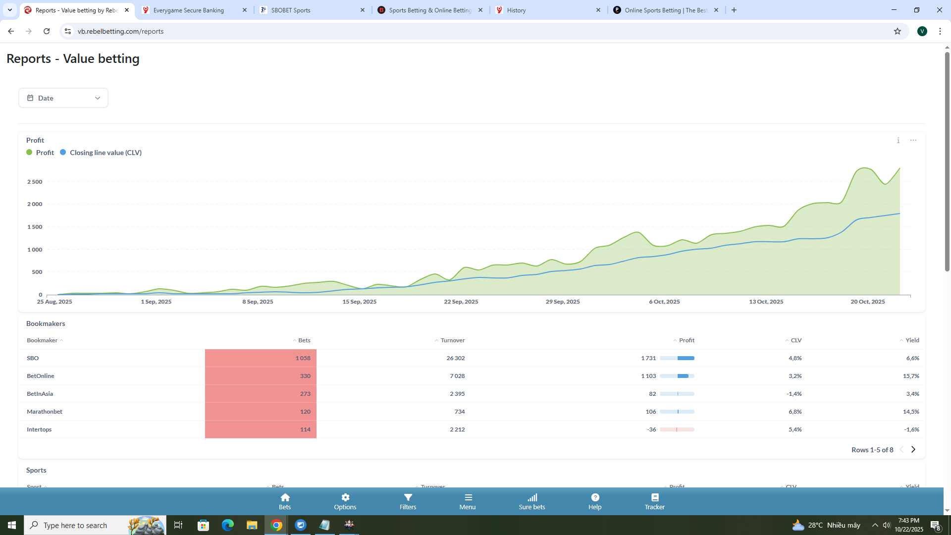 My actual profit is pretty good when compare to clv profit, but when i calculate the number exist in all bookmakers and find out in SBO bookmakers ( where my profit is 1k7 usd) after calculate the actual profit exist in sbo bookmaker is not fit with data in rebelbetting, it miss aroud 800-1k usd and i don’t know where it’s gone, i have calculated all fee or withdrawal order i have made and it still miss 800usd. IS data in rebelbetting trustworthy???