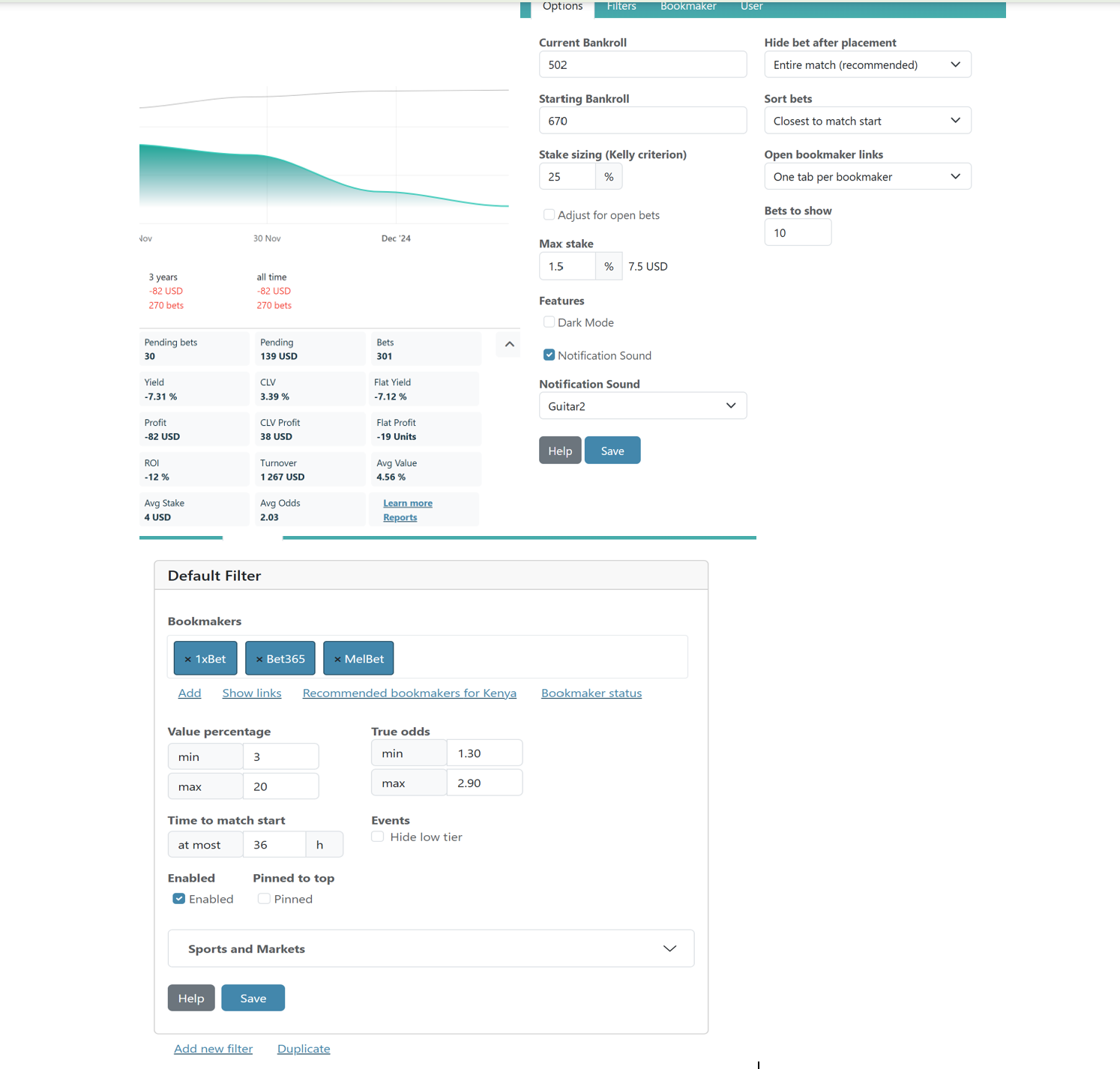 I have my max odds set to 7.0 - that will increase the number of bets but also the variance. If it feels “scary” with such a high odds range you can always manually reduce the suggested stake, lets say by 50% (an easy calculation). It is your choice what you think works best for you and what you are comfortable with.